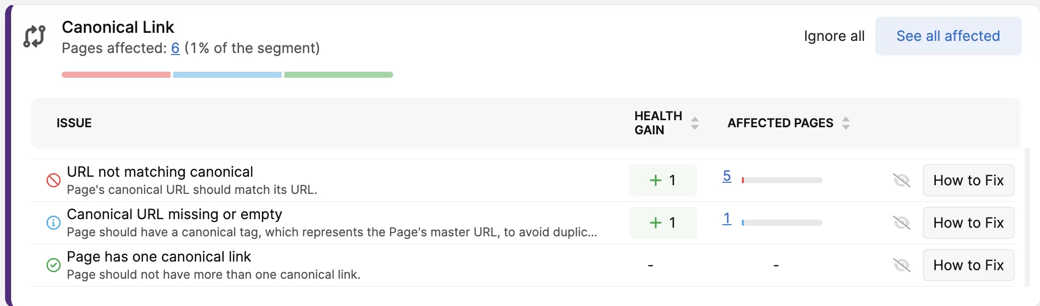 Se sei un utente di SearchAtlas , i contenuti duplicati e l'uso improprio dei tag canonici verranno contrassegnati nel rapporto di verifica del sito: