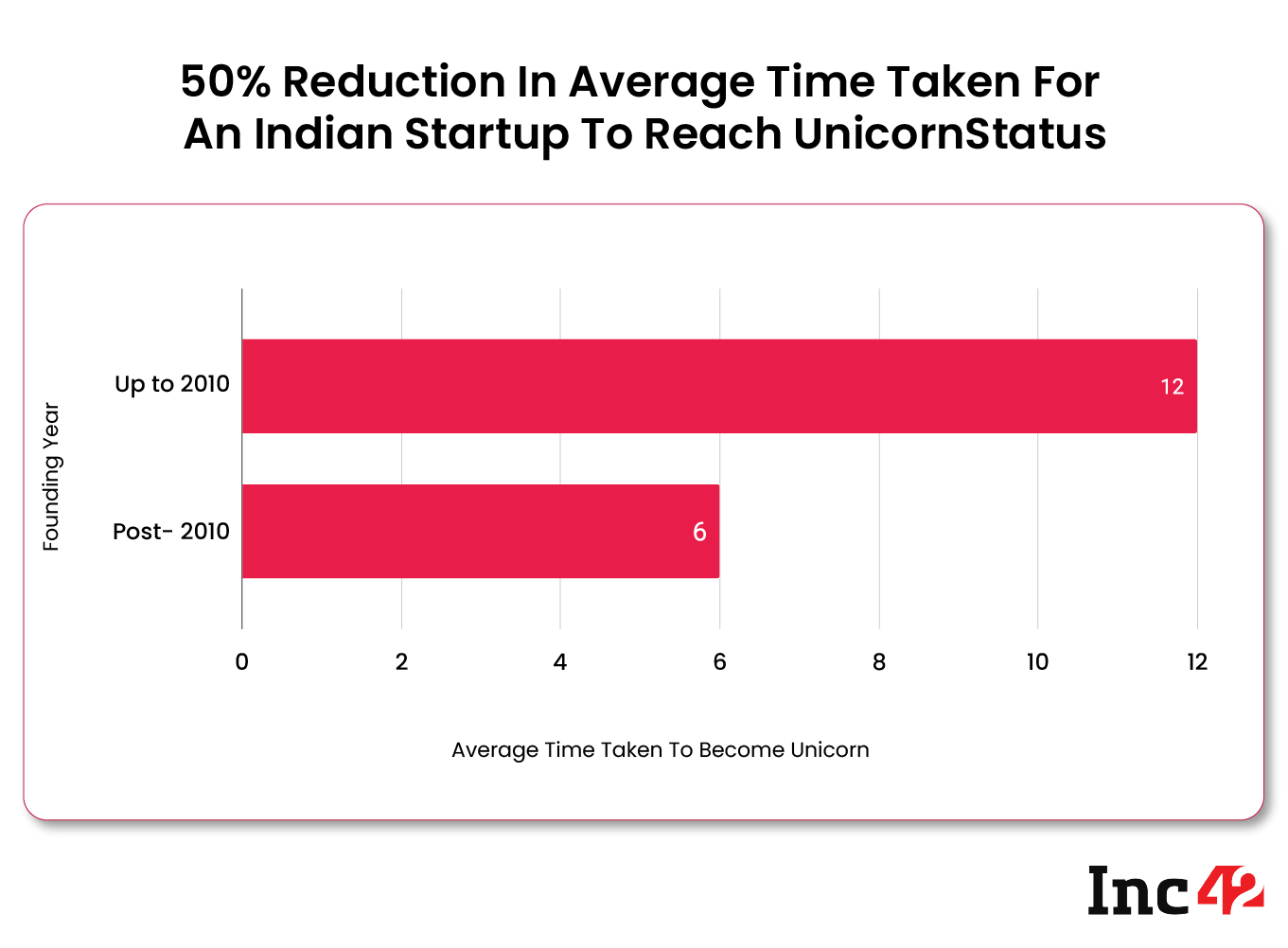 "The State of Indian Startup Ecosystem Report 2022" di Inc42 indica che le startup indiane stanno trasformando gli unicorni nella metà del tempo dopo il 2010 rispetto al tempo impiegato da loro prima del 2010.
