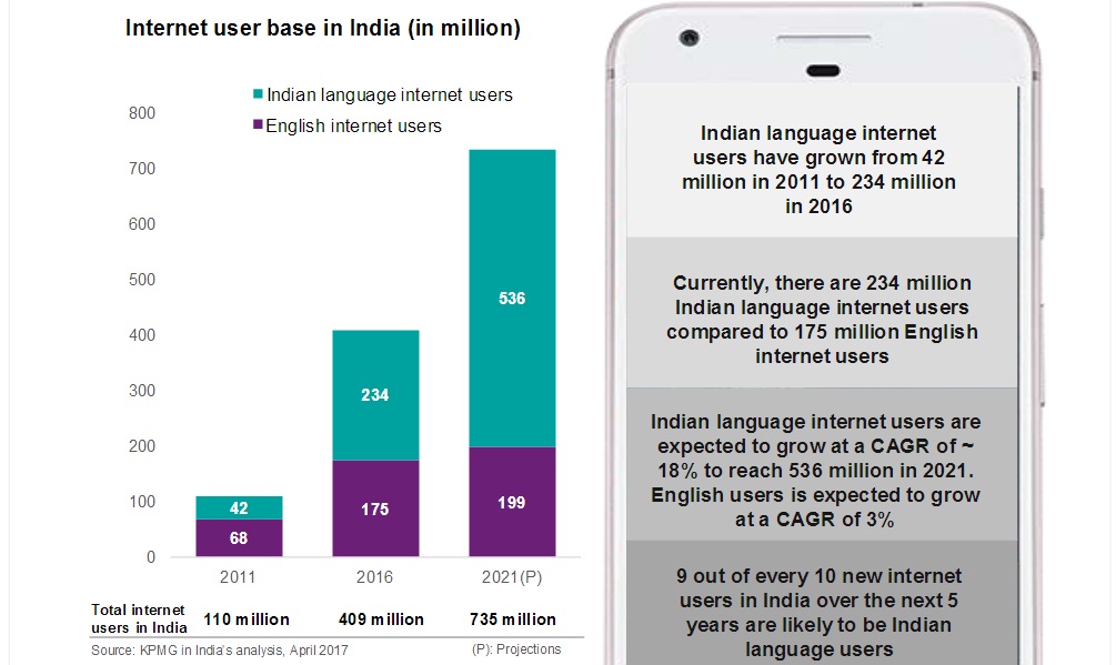 Inoltre, la base di utenti delle lingue locali continuerà a crescere del 18% all'anno fino a raggiungere 536 milioni nei prossimi quattro anni, rispetto alla base di utenti Internet in inglese che cresce del 3% fino a raggiungere 199 milioni . Pertanto, si prevede che gli utenti Internet in lingua locale rappresenteranno quasi il 75% della base di utenti Internet dell'India entro il 2021.