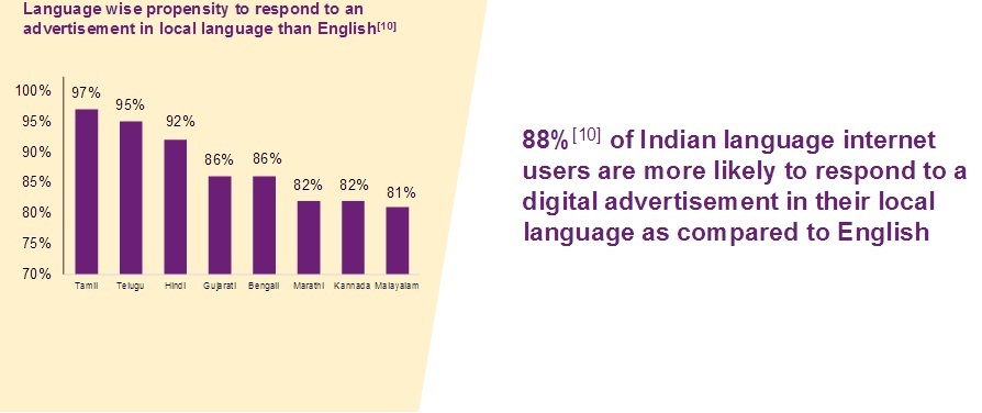 Inoltre, l'88% degli utenti di Internet in lingua indiana ha maggiori probabilità di rispondere a una pubblicità digitale nella propria lingua vernacolare rispetto all'inglese.