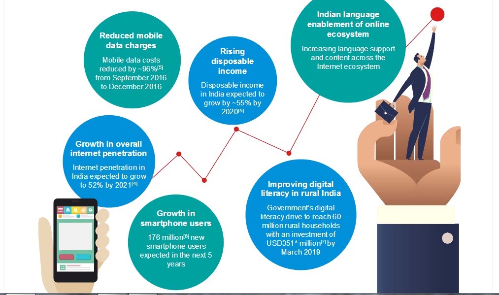 Ad esempio, l'etailing, a cui attualmente accedono 42 milioni di utenti Internet di lingua indiana, dovrebbe crescere a un CAGR del 32% per raggiungere 165 milioni di utenti entro il 2021.