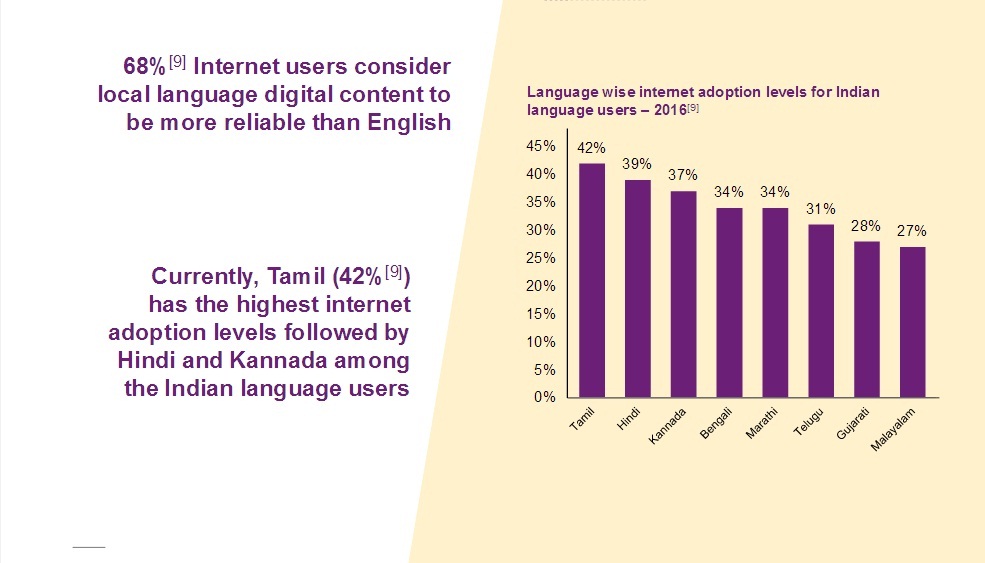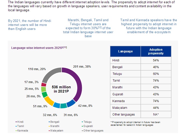 Secondo lo studio, l'adozione di Internet è più alta tra le lingue locali come tamil, hindi, kannada, bengalese, marathi, telugu, gujarati e malayalam . Si stima che marathi, bengalese, tamil e telugu formeranno il 30% della base totale di utenti di lingua locale nel paese. Attualmente, il tamil al 42% ha i livelli di adozione di Internet più alti, seguito dall'hindi al 39% e dal kannada al 37%.