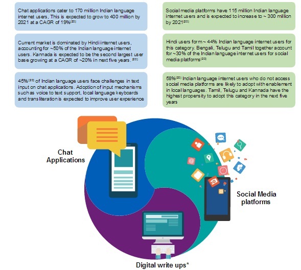 Infine, anche le piattaforme di chat e social media vedranno un enorme effetto. Le applicazioni di chat soddisfano 170 milioni di utenti Internet in lingua indiana. Questo numero dovrebbe crescere fino a 400 milioni entro il 2021 con un CAGR del 19%. Allo stesso modo, le piattaforme di social media che hanno 115 milioni di utenti Internet in lingua indiana, al momento, dovrebbero aumentare a ~ 300 milioni nei prossimi quattro anni.