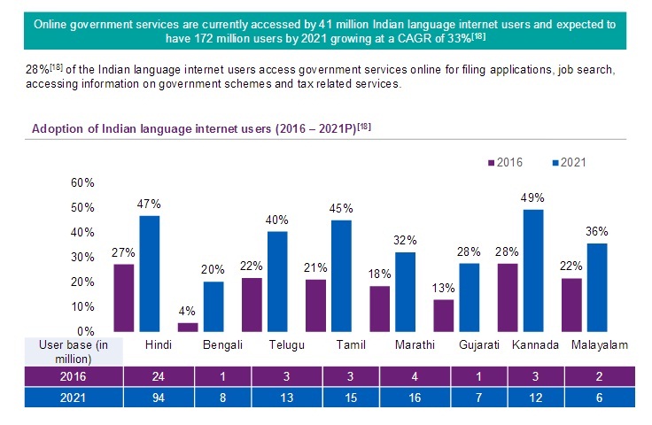 Per non rimanere indietro, anche i servizi governativi online aggiungeranno 131 milioni di utenti di lingua indiana entro il 2021.