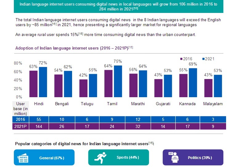 Allo stesso modo, le notizie digitali aggiungeranno altri 180 milioni di utenti di lingua indiana entro il 2021.