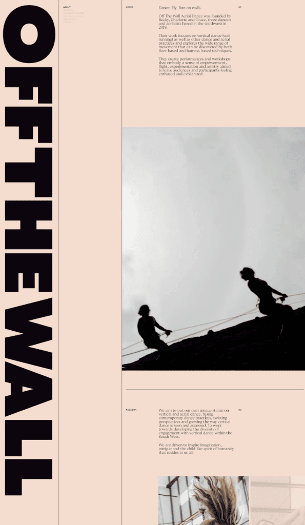 Ecco un testo verticale tanto audace quanto dinamico. Questa pagina dell'accademia di danza ottiene punti stile extra. Insegnando uno stile di danza che richiede la corsa sul muro, il geniale posizionamento verticale del testo crea lo stesso senso di movimento. Il testo nero in grassetto si abbina bene al colore di sfondo rosa tenue e il tutto sembra una galleria d'arte di alto livello. Rappresentare qualcosa di così orientato al movimento come la danza è un'arte stessa, e questo design lo fa con grande impatto.