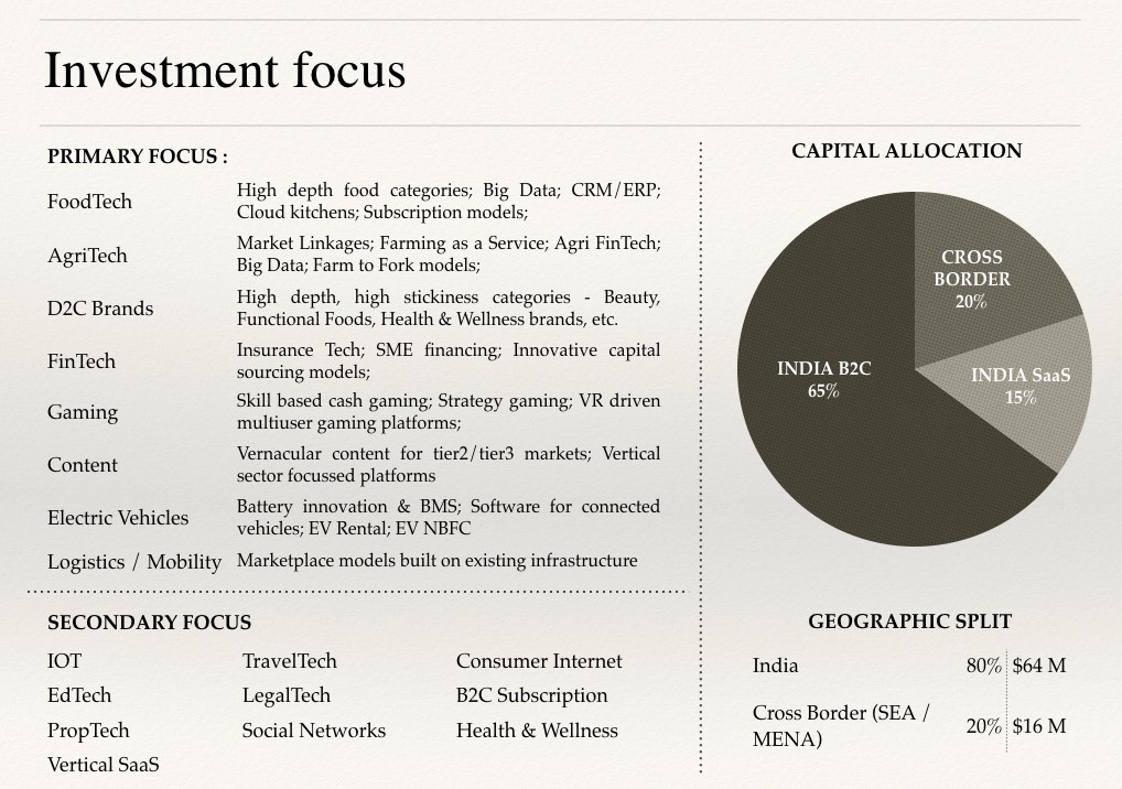 Sono un convinto sostenitore della scelta di una tesi generalista rispetto a una tesi specifica del dominio per i gestori emergenti, a meno che il gestore non abbia un paio di decenni di esperienza nel settore. In quanto tale, la mia tesi di investimento era abbastanza diversificata nell'ambito del tema generale dei consumatori. Per brevità, ho condiviso qui solo la diapositiva introduttiva della tesi. Ciascuno dei settori di interesse aveva una tesi di fondo con una pipeline di accordi associata. Potrei scrivere un blog separato per fare luce sullo stesso in un secondo momento.