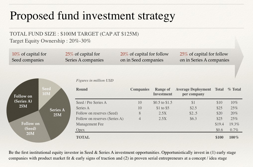 Anche se ho visto i miei colleghi globali raccogliere con successo un fondo per la prima volta di queste dimensioni, si è rivelata un po' difficile per me, dato il panorama del mercato indiano e la mia limitata esperienza di investimento. Quando ho fissato l'obiettivo del fondo di $ 100 milioni, l'ho fatto sulla scorta di una strategia di investimento che consentiva riserve di capitale significative per i round successivi nei vincitori di portafoglio.