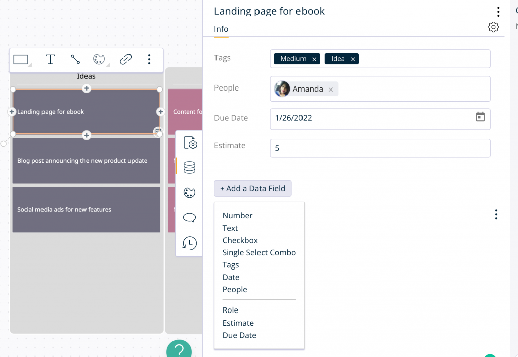 Suggerimento: utilizza la funzione Creately notes o il pannello dati per acquisire dettagli aggiuntivi del progetto come attività, stati, scadenze, durata, allocazione delle risorse e persino analisi del rischio in una posizione centralizzata.