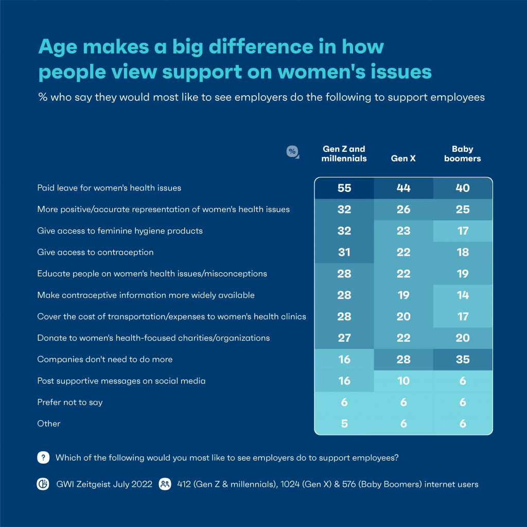 Soprattutto, i consumatori statunitensi vogliono che le aziende offrano un congedo retribuito per i problemi delle donne. Lo afferma il 55% della Gen Z e dei millennial, così come il 44% della Gen X e il 40% dei baby boomer. In seguito, gli americani vogliono che le aziende forniscano una rappresentazione più positiva/accurata dei problemi di salute delle donne, con il 32% della Gen Z e dei millennial che lo afferma, anche se questo scende al 26% della Gen X e al 25% dei boomer.