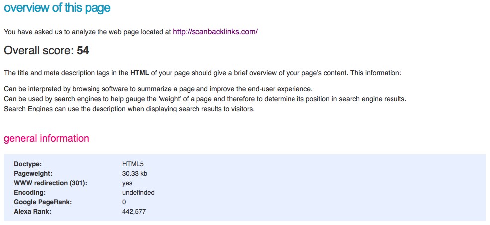 Questo strumento gratuito offre una vasta gamma di informazioni e ti aiuta ad acquisire molti dettagli sul sito Web che ti aiuterebbero a determinare e formulare nuove strategie di business. L'analisi dei contenuti, l'analisi delle parole chiave e gli altri dettagli che influiscono sul posizionamento sui motori di ricerca del sito Web sono tutti citati con una distribuzione e una struttura chiare in modo da aiutarti a capire qual è l'errore e dove si trova.