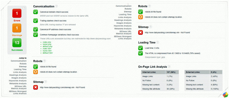 È uno strumento gratuito e facile da usare disponibile per i marketer e gli imprenditori per cercare di identificare i problemi del sito Web e gli errori SEO comuni che abbattono il sito Web e impediscono che funzioni in modo eccellente sul motore di ricerca.