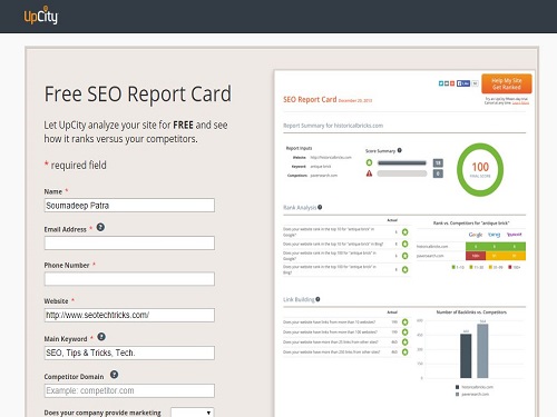 SEO Report Card è uno strumento efficiente di UpCity. È un fantastico strumento di controllo che offre un'analisi rapida del tuo sito web. È abbastanza veloce e i risultati possono essere visualizzati facilmente per analizzare ed esplorare il sito Web efficace ed efficiente. Lo strumento ti aiuta ad analizzare il tuo sito web per determinare le prestazioni del tuo sito web e come puoi potenziarlo ulteriormente per ottenere un vantaggio competitivo contro i tuoi rivali.