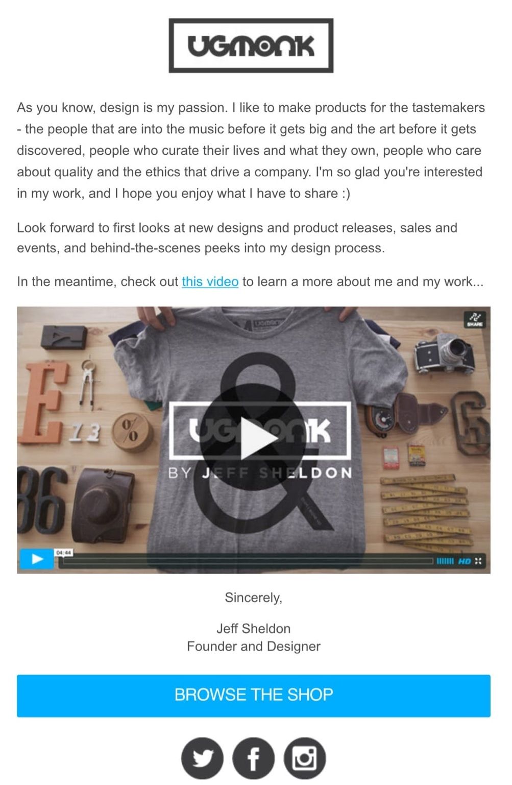 Di seguito è riportato un esempio di Ugmonk, che ha aggiunto un video alle proprie e-mail di benvenuto in modo che i propri iscritti capiscano meglio il proprio marchio.