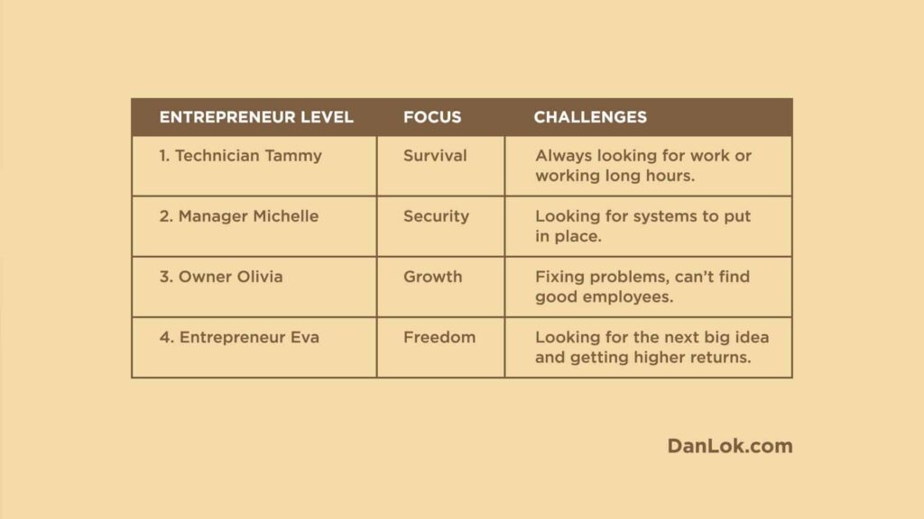 彼らにはビジネスがなく、別の仕事があります。 または、他の事業主は従業員を抱えていますが、消火に多くの時間を費やしているため、事業を所有していません。 彼らのビジネスは彼らを所有しています。 ビジネスの上位 2 つのレベルに到達できる起業家はわずか 3% です。