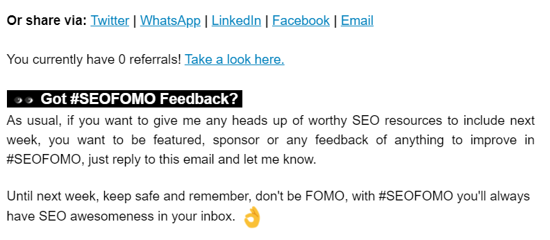 たまに、またはトランザクションを完了するたびに、顧客やニュースレターの視聴者にフィードバックを求めてください。 これにより、サービスを改善し、洞察を得て、全体的なカスタマーエクスペリエンスを向上させることができます。 SEOの観点からは、これはサイトのより熱心なオーディエンスを育成するのに役立つため便利です。 さらに、それはあなたの聴衆があなたのビジネスを説明し、参照するために使用する新しいキーワードを発見することを可能にします。 最も重要なことは、顧客からのフィードバックが、SEOの取り組みと将来のメールキャンペーンの両方に役立つ、より関連性の高いコンテンツの開発に役立つことです。