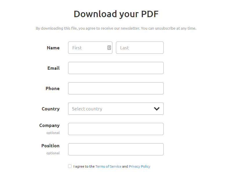 これは、リードマグネットを使用してリードを認定する例です。 SEMrushは、Webサイトでいくつかの電子書籍とガイドを提供していますが、電子メールアドレスを要求するだけではありません。 彼らは電話番号、国、会社、および役職を尋ねます。