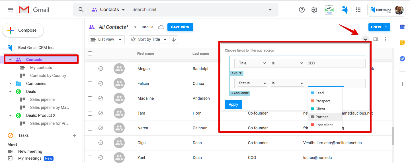 連絡先に移動してビューを作成するだけです。 ステータス、パートナーでフィルタリングします。 CEOの役職でフィルタリングします。