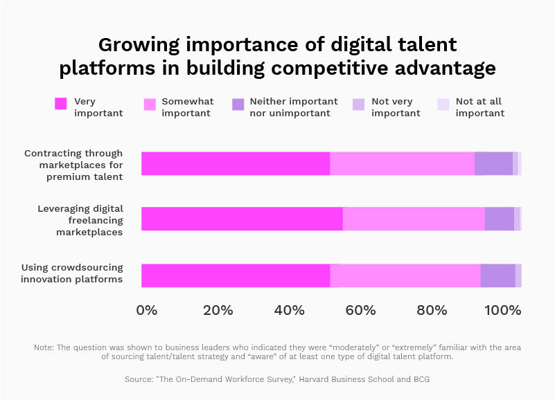 2019年には、ビジネスリーダーのほぼ90%が、フリーランスの人材プラットフォームをビジネスの将来にとって「非常に重要」であると考えており、60%が、フルタイムの労働力が縮小する可能性が「非常に」または「ある程度」あると述べています。将来。