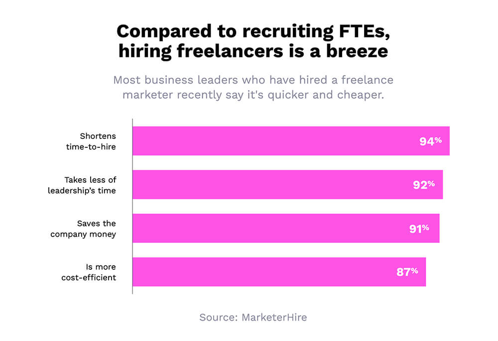 MarketerHireの最近のレポートでは、回答者の94%が、フリーランサーが採用にかかる時間を短縮することに同意しました。