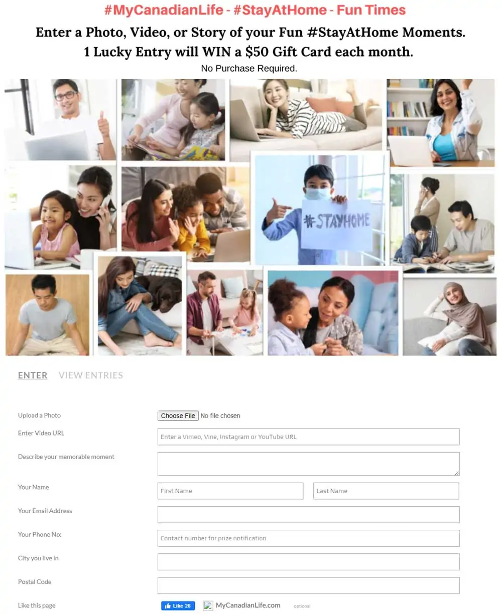 以下の景品の例では、組織は、写真、ビデオ、またはコメントの3種類のユーザー生成コンテンツを受け入れます。 さらに、参加者の場所、電子メールアドレス、電話番号に関する情報を収集します。これらはすべて、視聴者を理解し、つながるために不可欠です。