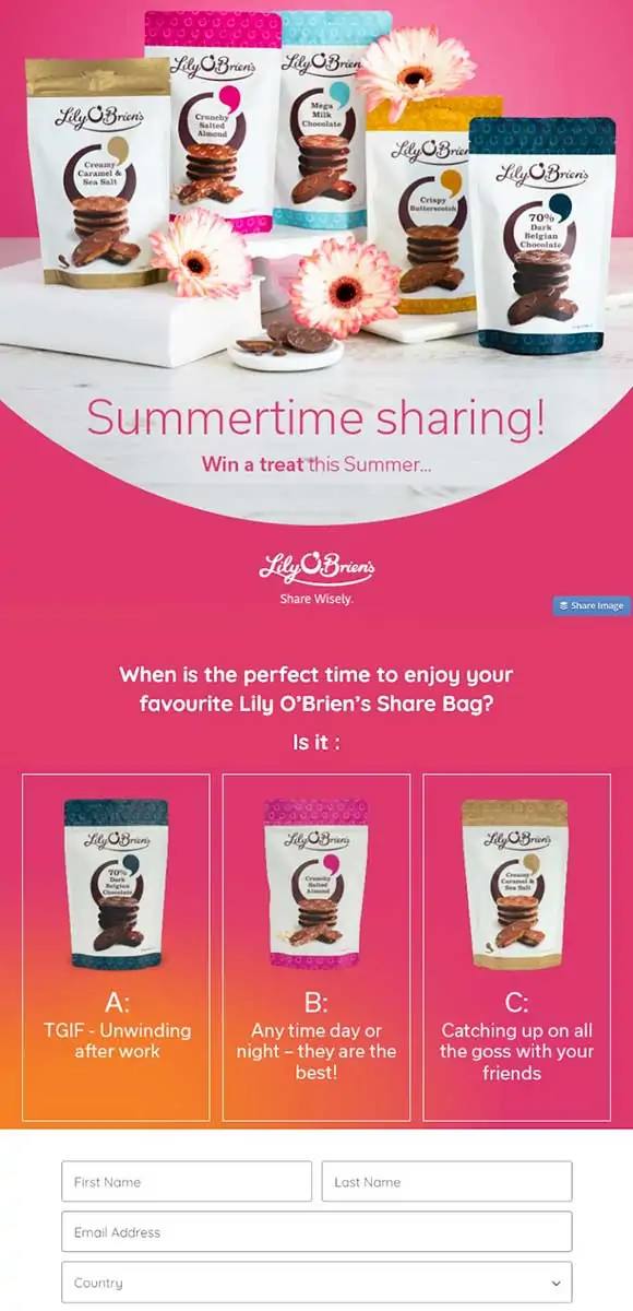 これを回避するには、コンテストや景品にランディングページを追加します。 ファンはFacebookの投稿にサインアップできますが、プレゼントのリンクを友人や家族と共有することでボーナスエントリを獲得できます。 以下では、参加者からファーストパーティのデータを収集するように設計されたランディングページを使用して、いくつかの景品のアイデアを検討します。