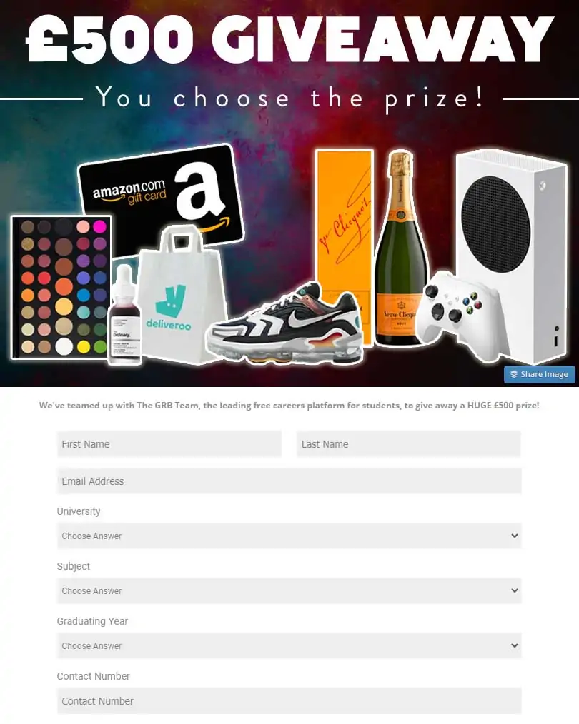 この行動を促すフレーズは、フォロワーにランディングページを共有するよう促します。 それはあなたの聴衆を拡大し、潜在的な買い物客とつながるより多くの機会を提供することができます。 次の景品の例では、代理店は、出席した大学と調査した科目に関するデータを収集します。