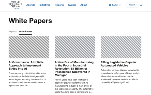 たとえば、世界経済フォーラムは、地域のビジネスや世界経済に影響を与える新しいテクノロジーや問題に関するホワイトペーパーを定期的に発行しています。