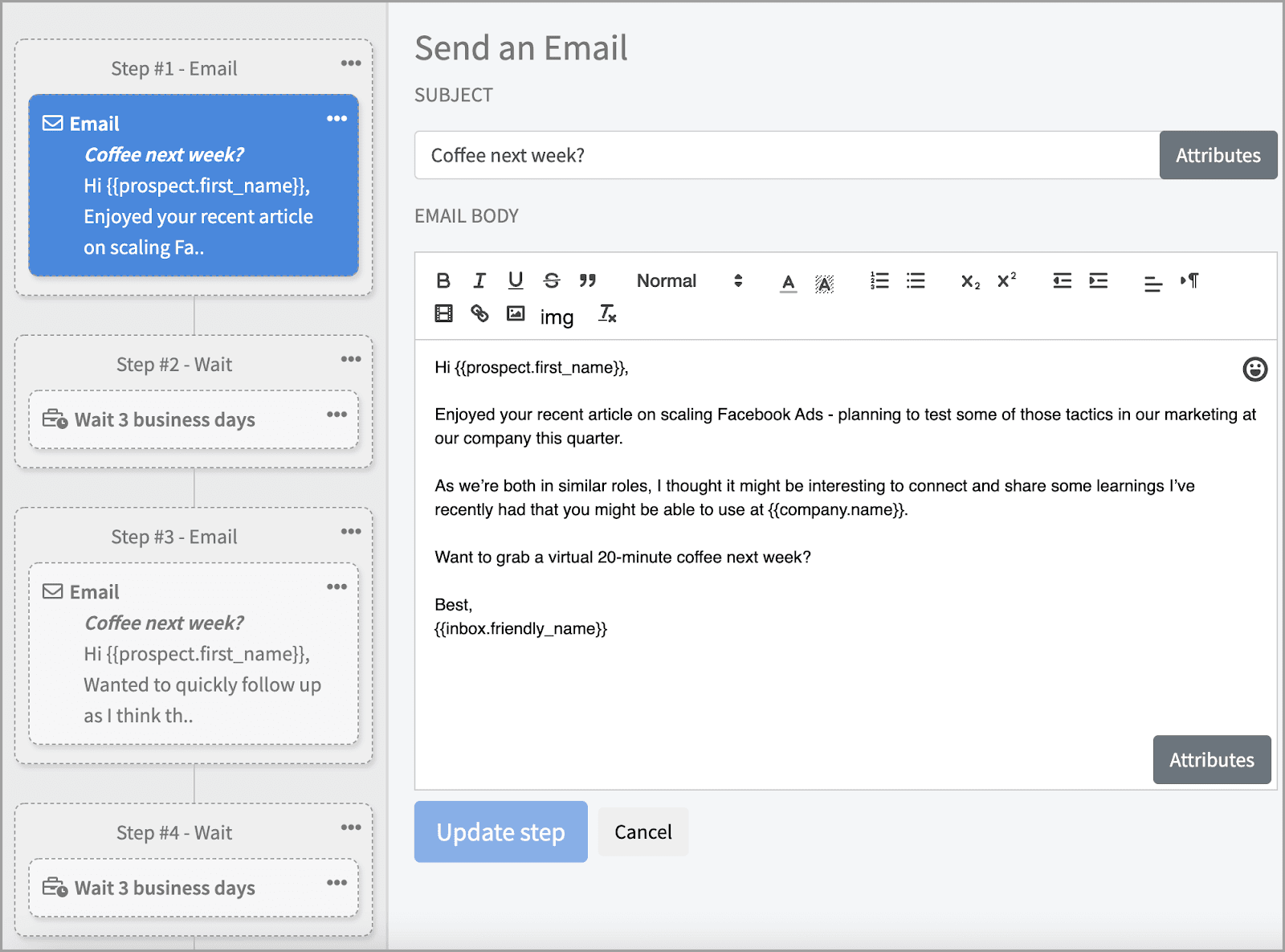 - 複数のステップからなるキャンペーンを構築し、送信する前に各ステップの明確な概要を確認できます。