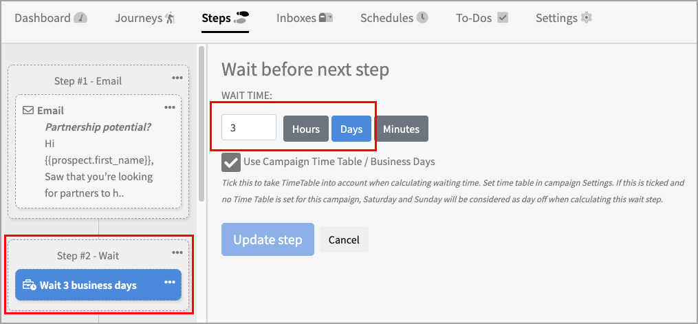 メディア アウトリーチ キャンペーンにフォローアップを追加するプロセスは簡単です。アウトリーチ ソフトウェアで遅延ステップを追加し、次のメールを作成する必要があります。 通常は 3 ~ 5 日の遅れで十分です。