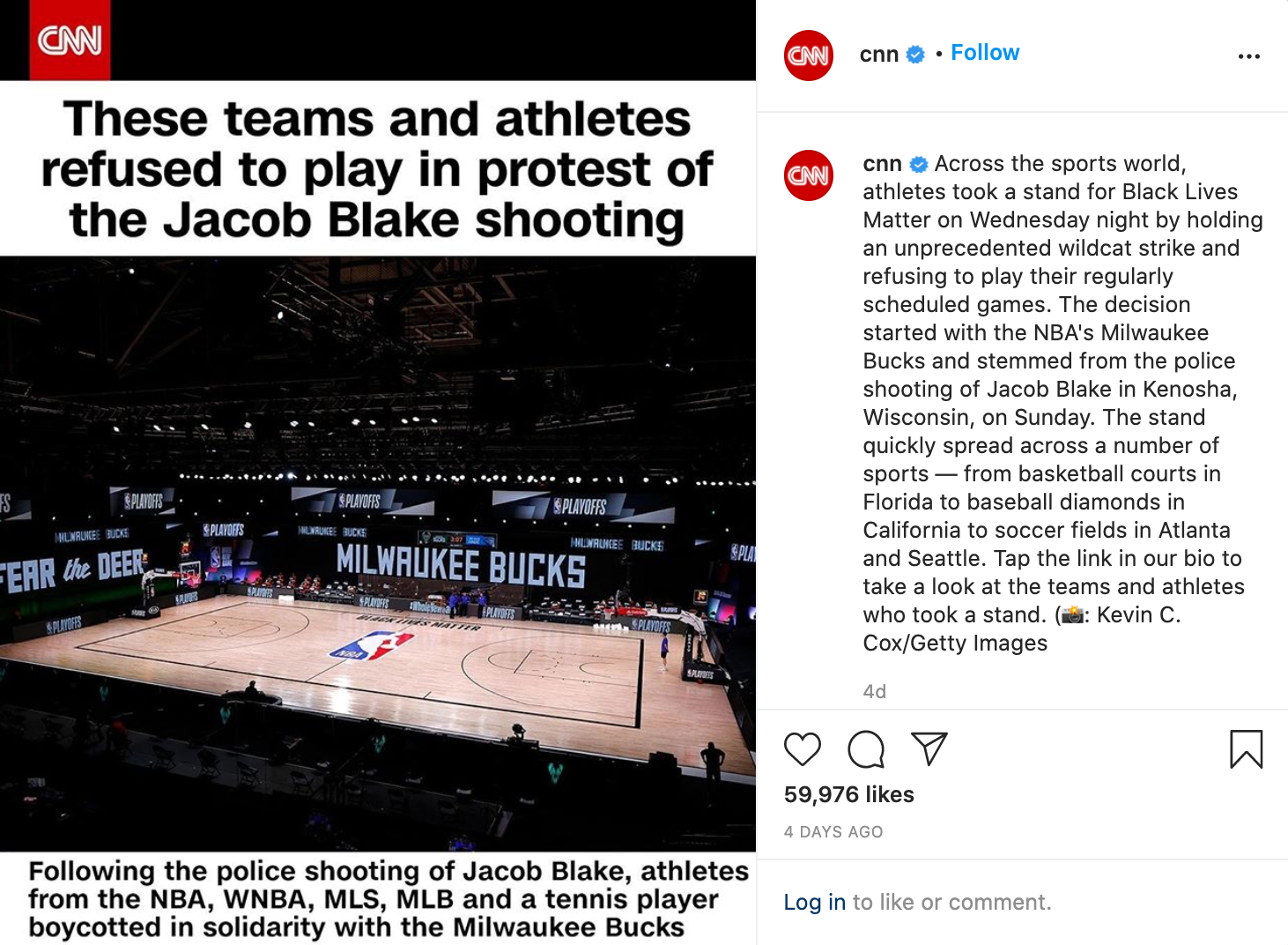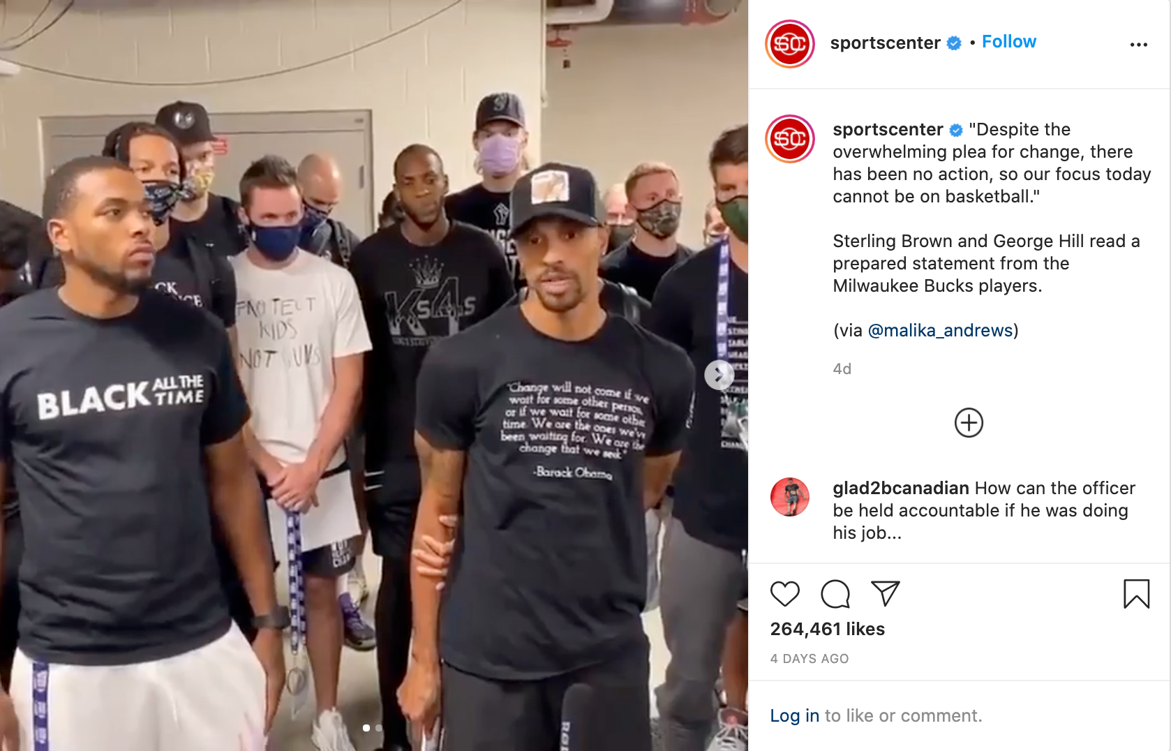 公開: 2020-09-02ミルウォーキーバックスは、警察の残虐行為に抗議するためにオーランドマジックとの対戦のゲーム5を中止した後、ソーシャルメディアで流行しました。 NBAチームは、NBAバブルの2020年シーズンの初めから、警察の残虐行為の犠牲者に正義を要求することについて声を上げてきました。 プレーヤーは、ゲーム前の国歌の間にブラック・ライヴズ・マターのシャツを着て、ひざまずきさえしました。 バックスが試合に出場しないという決定は、ミルウォーキー近くの町で警察が黒人男性を射殺したことに対応したものでした。 WNBAやMLSなどの他のメジャーリーグスポーツのチームも、抗議してゲームをボイコットしました。 IZEAのソーシャルインテリジェンスプラットフォームであるBrandGraphは、スポーツファンがソーシャルメディアでバックスの決定に対する反応を共有した後、ソーシャルメディアコンテンツとミルウォーキーバックスのエンゲージメントの急増を記録しました。 ソーシャルメディアの解説は、スポーツと社会政治の問題を混ぜるべきかどうかの議論を続けています。