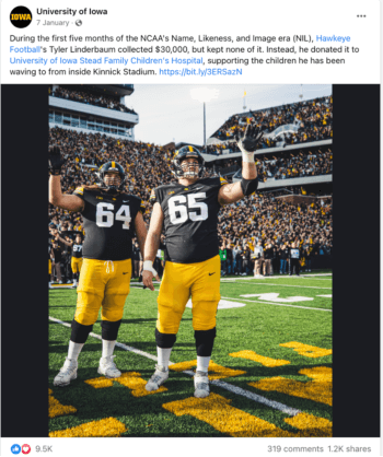 アイオワ大学は、その印象的なスポーツの成果について多くの投稿を行っていますが、多くの場合、最高のエンゲージメントを得る投稿は、フィールドで何が起こっているかについて話すだけではありません. 2022 年 1 月に共有された投稿は、アイオワ大学のその年の上位 5 つの投稿にランクされ、その選手の 1 人がフィールド内外でいかにヒーローであるかを示しました。 大学は、センターのタイラー リンダーバウムの写真を投稿し、NCAA の名前、肖像、画像時代の最初の 5 か月間に 30,000 ドルを集めたというキャプションを共有しました。以前は付与されていませんでした。 しかし、リンダーバウムは自分のポケットを埋める代わりに、すべてのドルをアイオワ大学ステッド ファミリー チルドレンズ ホスピタルに寄付しました。