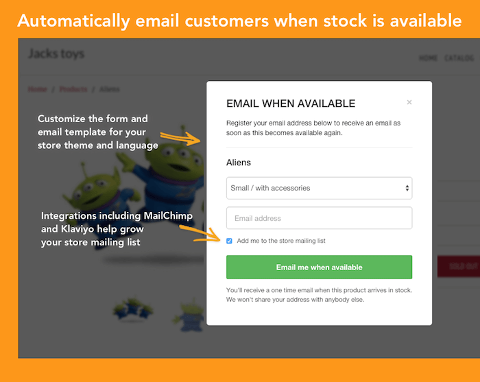 在庫に戻ると、商品の在庫が戻ったときに買い物客に電子メールアラートにサインアップするオプションを提供することで、在庫切れによる顧客の解約の可能性を減らします。
