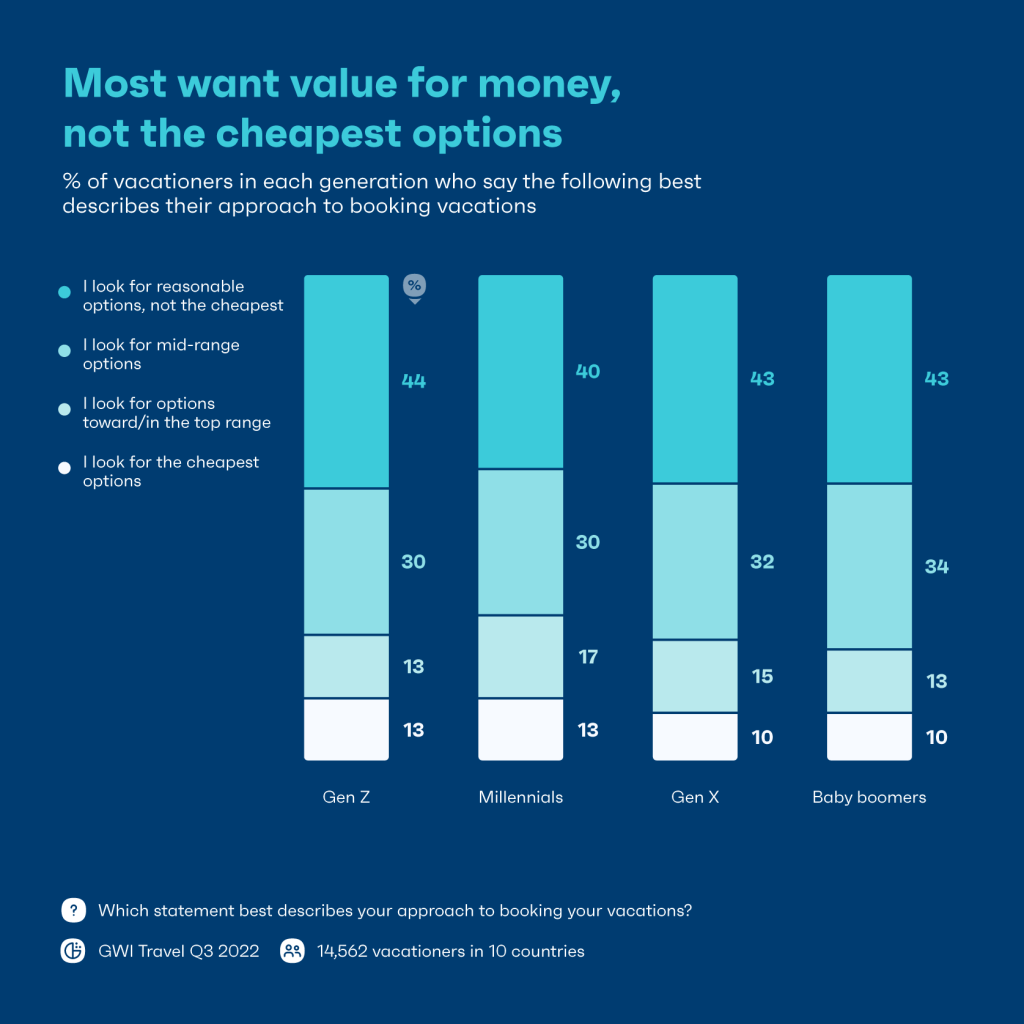 Skyscanner などの価格比較サイトでは、数回クリックするだけで旅行の最安値を見つけることができます。 このような情報源を利用して最安値を探すのは、Z 世代にとって第二の性質です。Z 世代は、海外旅行を検討する際に最も安いオプションを探す可能性が最も高い世代です。