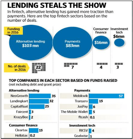 대체대출은 지난해 핀테크 분야에서 가장 큰 주목을 받았다. 22건의 거래를 통해 1억 3백만 달러의 자금을 지원받았습니다. NeoGrowth, LendingKart 및 Capital Float, 모든 SME 파이낸싱 업체는 SAIF Partners, Aspada Partners, Omidyar Network와 같은 회사로부터 대규모 자금을 조달했으며, 이는 인도 투자자들이 현재 중소기업 대출에 많은 편을 들고 있음을 보여줍니다.
