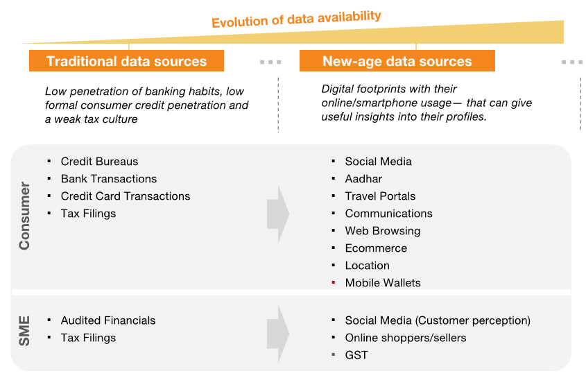 그렇다고 은행을 전적으로 탓할 수는 없다. 낮은 신용 침투율(개인 및 중소기업 모두), 특히 낮은 무담보 신용은 주로 인도 시민이 이러한 대출 기관의 관점에서 '무기소' 또는 '무신고' 고객이기 때문입니다. 그러나 이제 우리는 여러 디지털 스트림에 대한 액세스가 데이터 빈곤 국가라는 기존의 문제를 어떻게 해결하는지 보기 시작했습니다. 수백 가지 소스의 데이터를 데이터 모자이크에 오버레이하면 대출 기관이 정확한 고객 프로필을 형성하는 데 도움이 되며, 이를 통해 대규모 맞춤형 제품 제공이 가능해야 하며, 이 부문의 수익성이 그 어느 때보다 높아집니다. 섹션.
