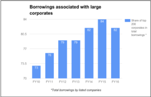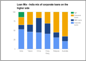 인도 은행은 대출의 약 54%가 기업 부문으로 향하고 있어 기업 부문에 크게 치우쳐 있습니다. 추가 분석은 상위 200개 기업이 전체 기업 차입금(비은행 출처 포함)의 80% 이상을 차지하는 대규모 차입업체에 집중하고 있음을 강조합니다. 이에 따라 소비자 및 중소기업 부문의 대부분의 차용인은 이자율이 24-60%만큼 높을 수 있는 비공식 시스템에 의존해야 합니다. 이는 중소기업이 국가 GDP에 45%를 기여하고 기업 부문이 기여하는 15%와 비교된다는 사실에도 불구하고.