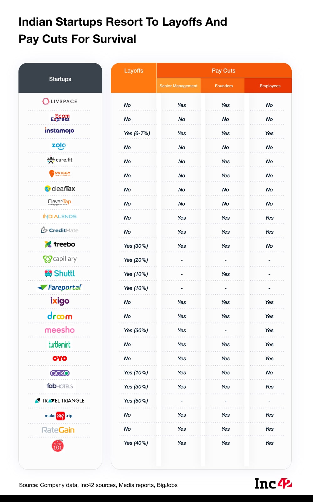또 다른 OTA ixigo에서는 창업자들이 급여를 포기한 반면 직원들은 여행 산업의 상황이 개선될 때까지 회사가 활주로를 관리하는 데 도움을 주기 위해 급여를 삭감했습니다.