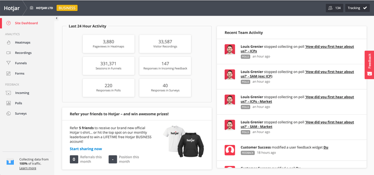 Hotjar는 웹사이트의 사용자 경험을 보기 위해 단일 전자상거래 대시보드에서 사용자 데이터의 품질과 양을 결합하는 전자상거래 분석 소프트웨어입니다. 전자 상거래 상점 소유자에게 히트맵을 통해 웹사이트에서 방문자의 활동에 대한 추적 보고서를 수집하고 비디오 형식, 전환 유입경로 및 고객 행동으로 기록된 세션을 수집하는 피드백 도구가 포함된 심층 웹사이트 분석 보고서를 제공합니다.