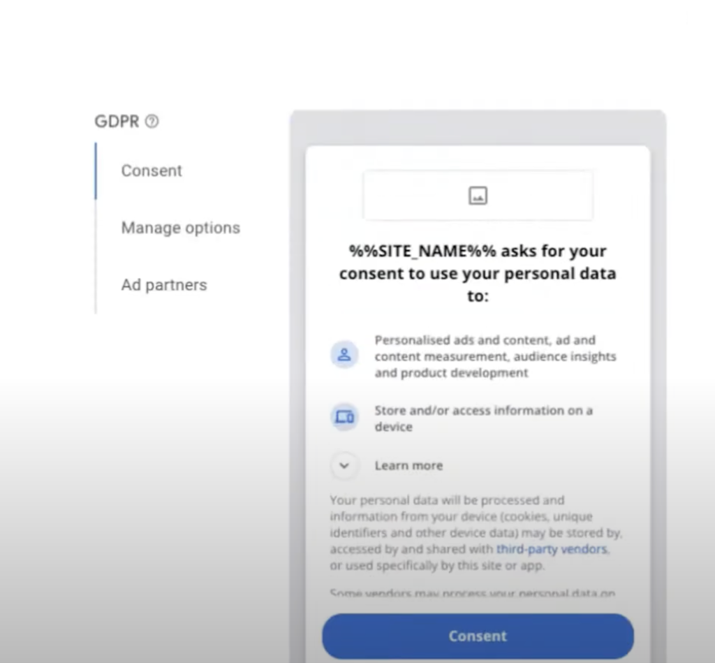 - 비 IAB GDPR 메시지를 사용하는 경우 광고 파트너 선택은 광고를 표시하거나 처리할 수 있는 광고 파트너를 제어하는 데 사용됩니다.