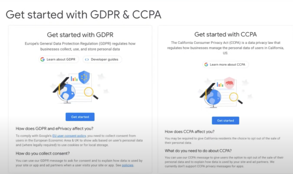 GDPR 및 CCPA는 광고하는 동안 사용자 개인 정보를 존중하는 데 매우 중요한 역할을 합니다. 이러한 개인 정보 보호 규정이 귀하의 비즈니스에 어떤 영향을 미칠 수 있는지 이해하는 데 도움이 되도록 개인 정보 및 메시지 탭에는 위 이미지와 같은 '개인 정보 보호 규정 교육 카드'가 포함되어 있습니다.