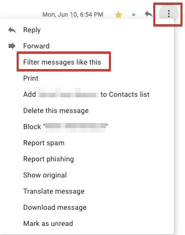 - Gmail은 "보낸사람" 필드에 발신자 세부정보를 자동으로 채우므로 "이와 같은 메시지 필터링"을 선택한 다음 팝업 창에서 "필터 만들기"를 선택하십시오.