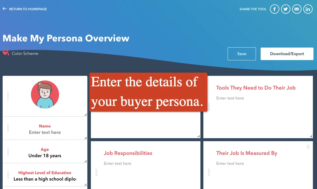 구매자 페르소나를 만드는 것도 쉽습니다. Hubspot과 같은 무료 구매자 페르소나 생성 도구를 사용하십시오.