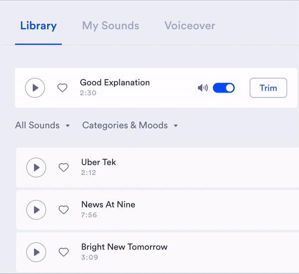 Wibbitz 음악 라이브러리에는 악기 또는 보컬이 포함된 수백 개의 사운드트랙이 있습니다. 다양한 "기분"을 분류하여 "이봐, 이것이 바로 사람들이 우리 제품을 볼 때 느끼기를 바라는 것이 바로 이거야!"라고 생각하게 만드는 노래를 찾을 수도 있습니다.