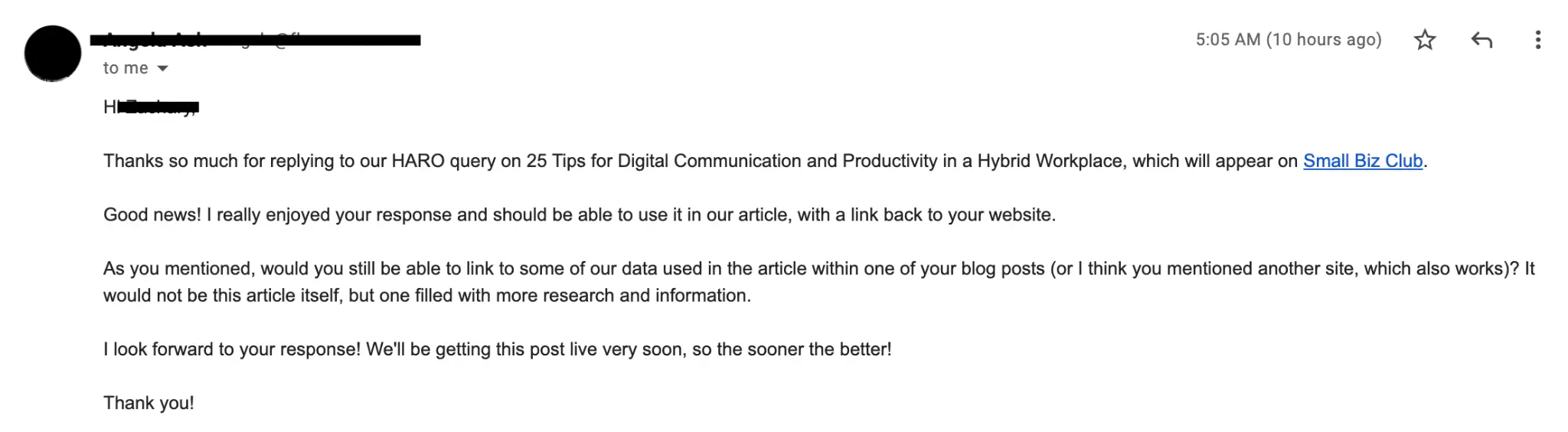 편집 링크를 얻는 또 다른 방법은 저자에게 연락하여 귀하의 글을 사용하도록 요청하는 것입니다. 코멘트를 제공할 수 있다고 말할 때 덤덤하게 놀리는 대신, 즉시 단락을 작성하여 그들에게 바로 보내십시오.