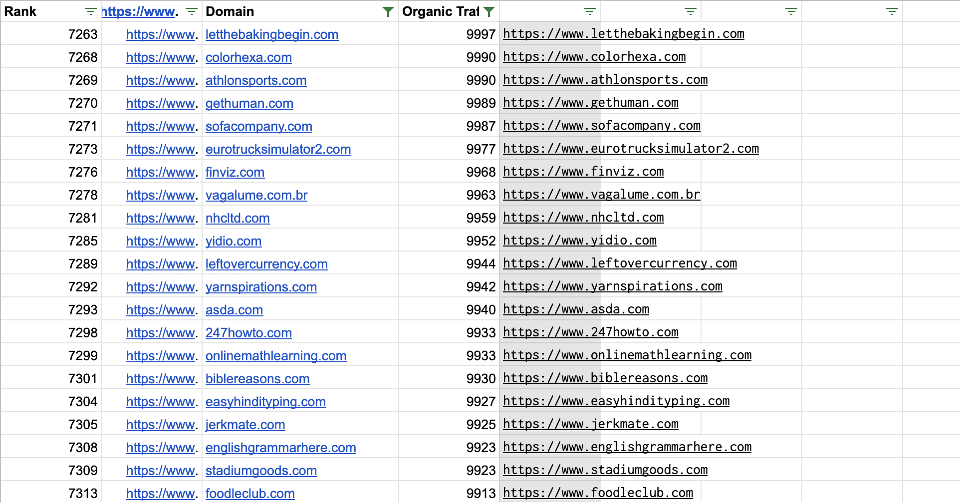 SEMRUSH에서 사이트를 내보낸 후 트래픽별로 필터링하여 Screaming Frog에 조금씩 넣습니다(예: 한 번에 2,000개 사이트).