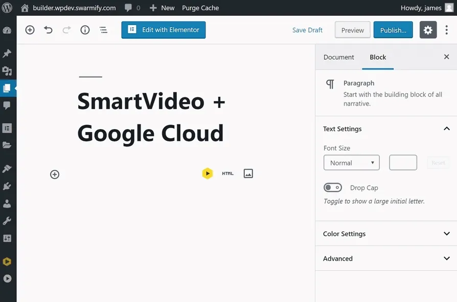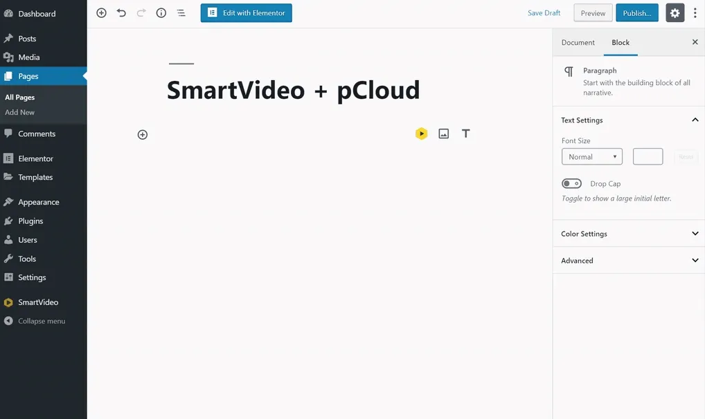WordPress에서 페이지를 편집하는 동안 SmartVideo 로고 를 클릭하여 SmartVideo 블록을 추가합니다. 실시간 미리보기에 자리 표시자 비디오가 표시됩니다.