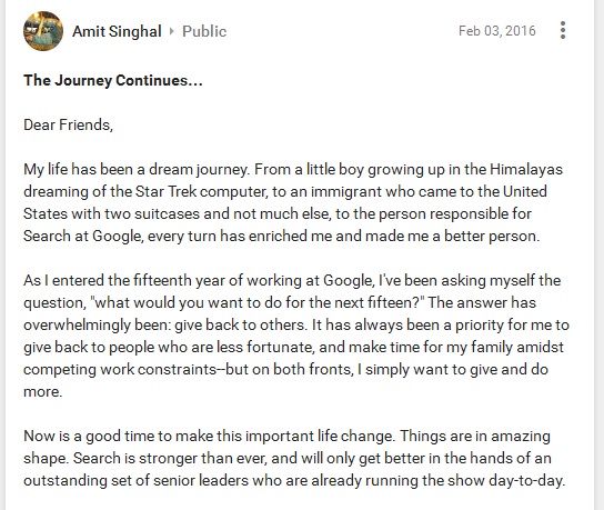 보고서에 따르면 Uber 경영진은 작년에 Recode 가 Amit과 Google 사이에 무슨 일이 있었는지 알린 후 상황을 알게 되었습니다. Alphabet Inc.의 Google에서 검색 기술 책임자였던 Singhal은 15년 간의 회사 생활을 마치고 지난 2월 회사를 떠났습니다. 당시 Google은 Singhal이 은퇴한다고 밝혔고 Singhal도 은퇴에 대해 다음과 같이 말했습니다.