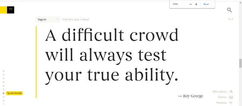 Quatro Slab to doskonały przykład na to, jak wysoki kontrast i pogrubiona czcionka Serif mogą stać się tak popularne w ciągu zaledwie kilku lat. Został zaprojektowany przez Marka Caneso w 2012 roku i jest dostępny w 5 grubościach czcionek.