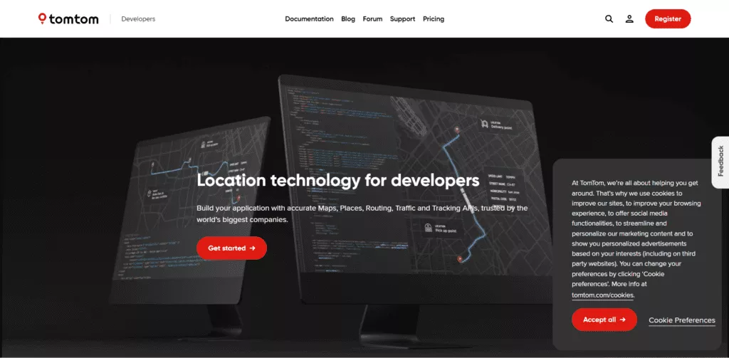 Niezależna od map platforma klasy korporacyjnej Sygic oferuje oparte na chmurze mapy od HERE, TomTom, OSM i niektórych innych dostawców. Chociaż nie publikują swoich cen online, obiecują, że są bardzo rozsądne i dostępne, co pomogło im przyciągnąć 200 milionów użytkowników w ciągu ostatnich 15 lat. Możesz łatwo uzyskać przykładowy klucz API tutaj.